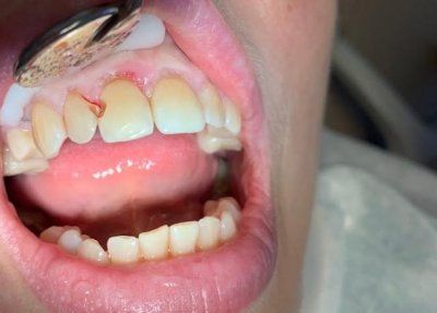 Пациенту было проведено лечение среднего контактного кариеса 11,12 зубов.