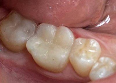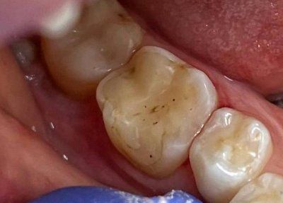 Пациент обратился в клинику с жалобой на изменение цвета зуба, после проведения комплексного обследования было проведено лечение глубокого кариеса, замена несостоятельной реставрации 46 зуба (материал Ceram A2).