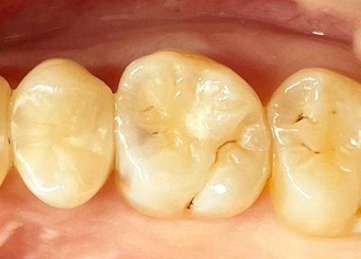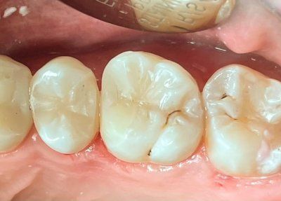 Клинический случай: зуб в позиции 16, глубокий кариес на медиальной поверхности. Лечение проведено с использованием изоляции системой коффердам, реставрация выполнена пломбировочным материалом CeramX A2.