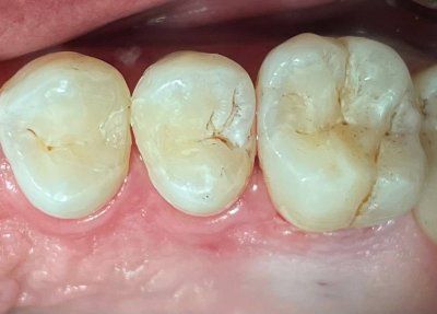 Клинический случай: зуб в позиции 15, контактный средний кариес на медиальной поверхности зуба. Лечение проведено с использованием изоляции системой коффердам, реставрация выполнена из пломбировочного материала CeramX A3.