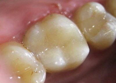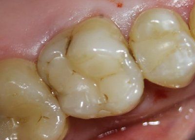На окклюзионной поверхности пломба с нарушением краевого прилегания, на небной поверхности кариес. Проведены все этапы удаления кариса с восстановлением коронки зуба. материалом Estelite Sigma A3.